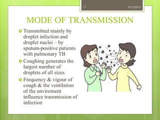 With TB however the mode of transmission is the cough or sneeze that releases TB bacterium into the air. Mode of transmission of TB.